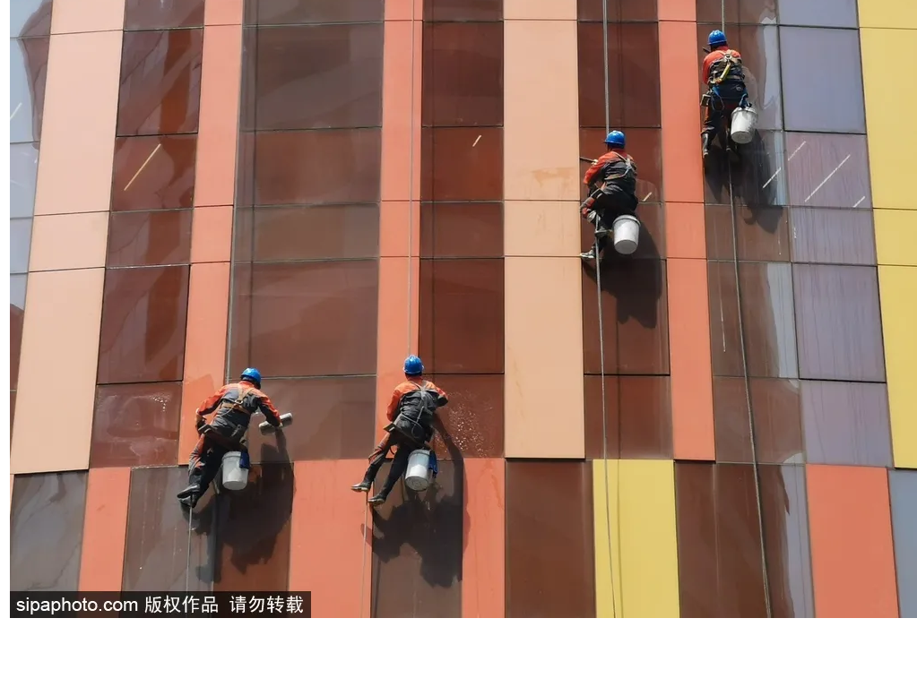 In the hot summer, the "spider men" working in heat are fully armed, cleaning up the glass acurtain walls of tall buildings without any ambiguity, and always sweating for them.