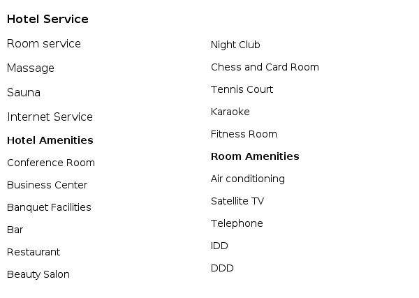 All rooms are equipped with central air-conditioning, IDD, DDD, Internet access, satellite TV, and mini-bar.