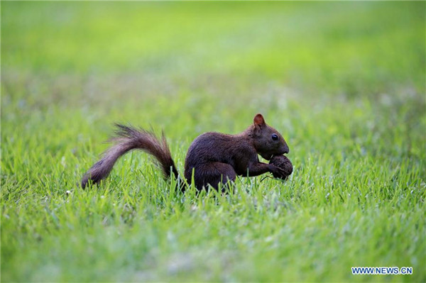 A squirrel eats nut at the Temple of Heaven in Beijing, capital of China, Aug. 1, 2016. (Xinhua/Liu Xianguo)
