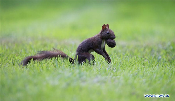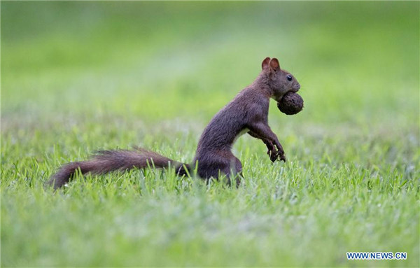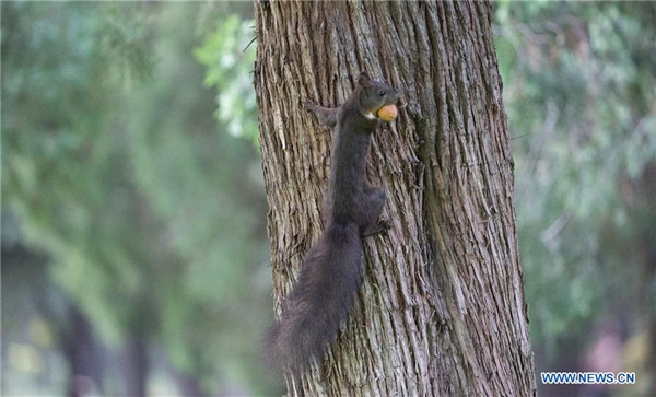 A squirrel holds a nut in mouth at the Temple of Heaven in Beijing, capital of China, Aug. 1, 2016. (Xinhua/Liu Xianguo)