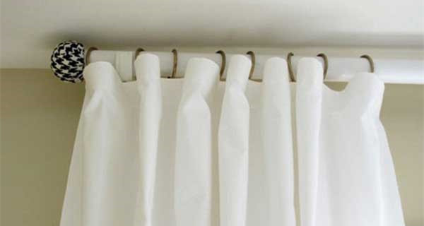 Changing up your curtain rod finials can be as simple as using a cutting out a hole in a tennis ball (enough to get for the rod to fit through).