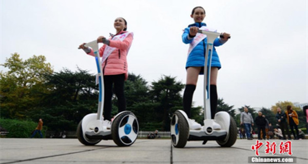 Two girls ride Segways on the road. (File photo/Chinanews.com)