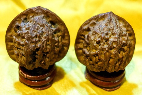 Collectible walnuts are said to have a medicinal value. The bumpy edges and irregular shape make them a tool for massaging acupoints in the palms. Squeezing and rolling a pair of walnuts is believed to retard aging and prevent heart disease.