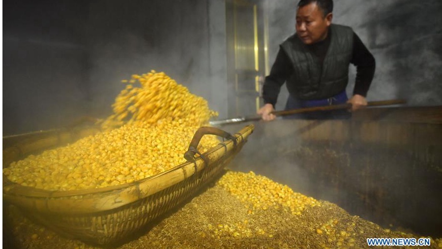 A brewer prepares corns to make wine at a workshop in Huangping Village of Xuan'en County, central China's Hubei Province, Jan. 21, 2018. The corn wine is a traditional festival drinking for people of Tujia ethnic group. (Xinhua/Song Wen)