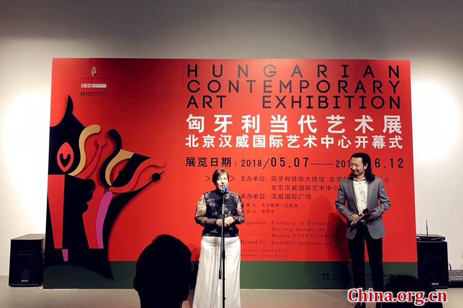 An exhibition showcasing contemporary Hungary art opens at the Hanwei International Art Center, Beijing, on May 7, 2018. The exhibit features 97 paintings and 23 glass sculptures, reflecting the latest trends in Hungarian and Central European art. The exhibition, open through June 12, was organized by the Embassy of Hungary in Beijing, the Beijing Hungarian Cultural Institute and Hanwei International Art Center. [Photo by Guo Xiaohong / China.org.cn]