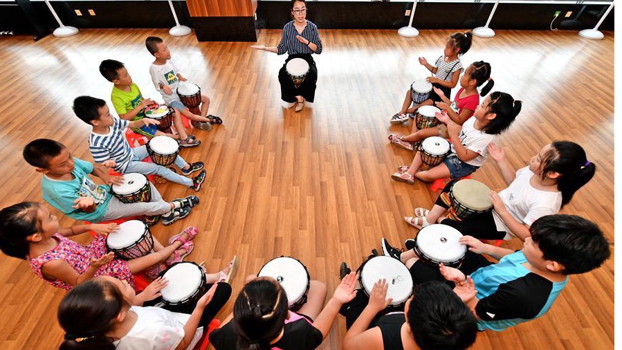 An art teacher (C, back) teaches children play African drum at Anci cultural center in the Anci District of Langfang City, north China's Hebei Province, Aug. 16, 2018. Children attend free art classes to enrich their summer vacation. (Xinhua/Liu Xuemin)
