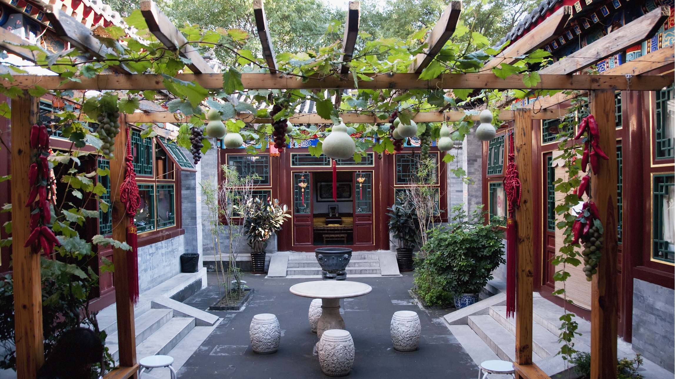 Inside, the yard is full of lush grasses and trees and is brimming with exquisite elegance and old-world charm. As seasons come and go, the scene changes, which is very interesting. On leisure time, you can take a stroll to the garden patio, tea house and cloisters to soak up the authentic courtyard culture unique to the old Peking in closer distance.