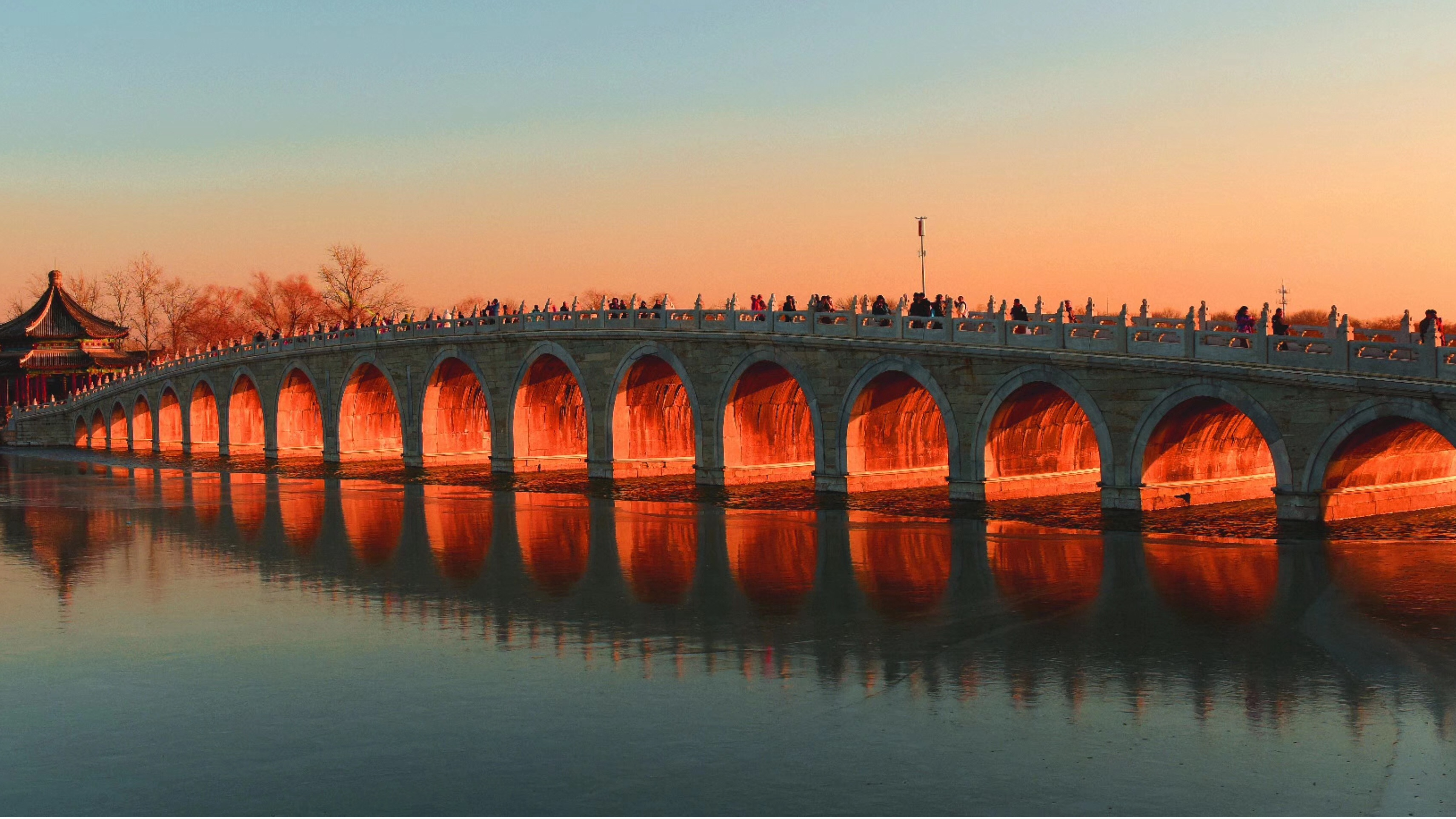 Golden lights will penetrate through the Seventeen-Arch Bridge on Kunming Lake at sunset, and if we head south to the West Causeway, there are fewer tourists. Dark yellow withered grass, interlaced branches and the lake-surface with scattered ice make different winter scenery of serenity.