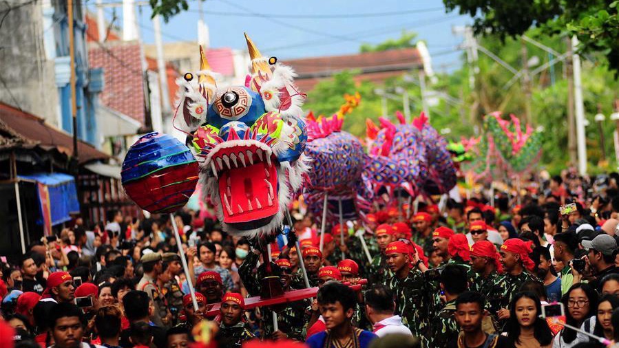 People perform dragon dance during a Cap Go Meh Festival celebration held by the Chinese community in Padang of West Sumatra, Indonesia, Feb. 8, 2020. The Cap Go Meh Festival, also known as Lantern Festival, is celebrated on the 15th day of the Chinese Lunar New Year. (Photo by Ardhy Fernando/Xinhua)