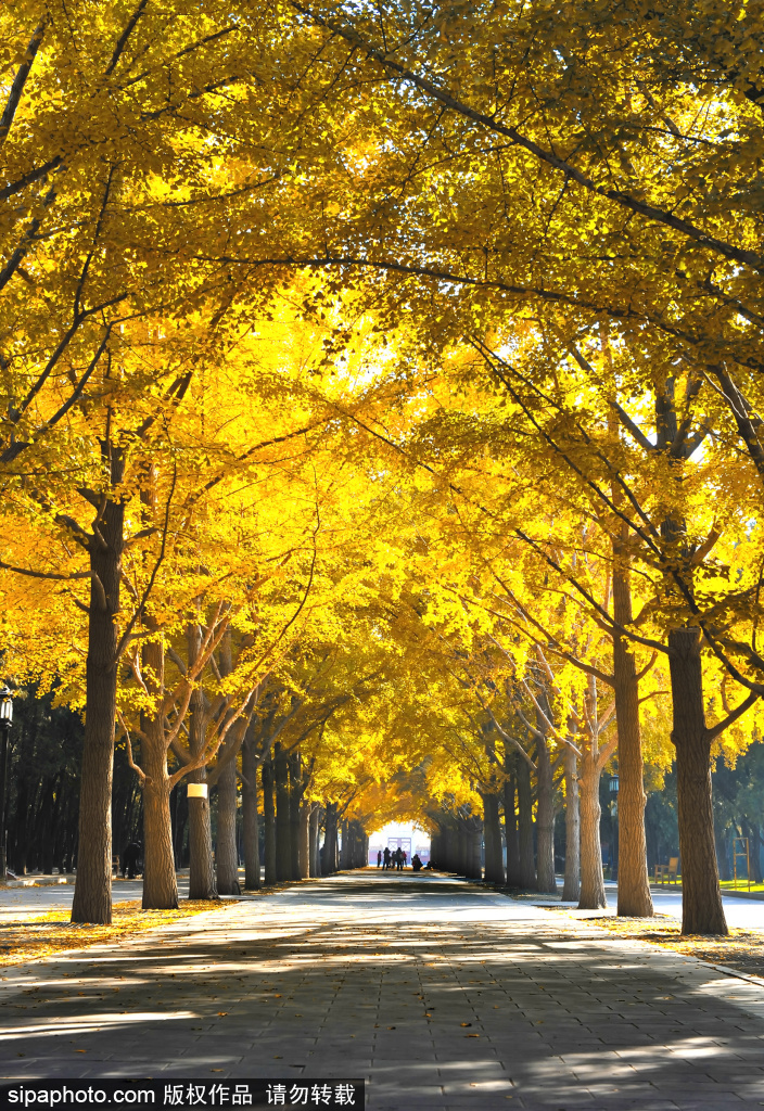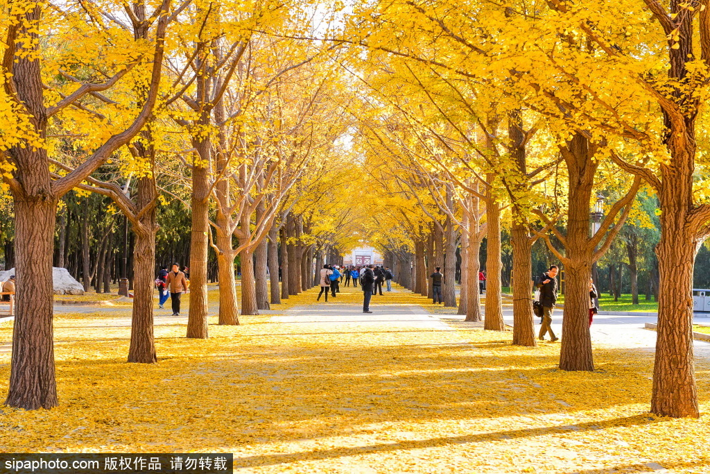 When entering the North Gate of the Temple of Heaven Park, a ginkgo avenue comes into view, with golden ginkgo trees and ancient buildings in the same frame, creating a delightful sight.