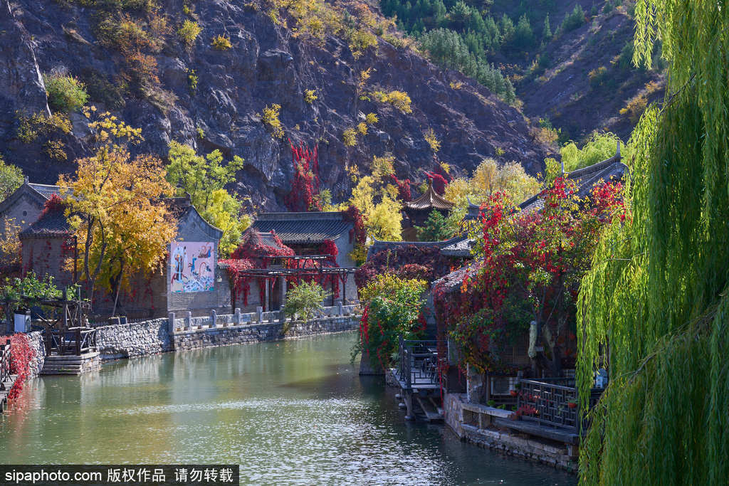 Beijing Gubei Water Town transforms into a red leaf town and showcases its vibrant colors under the sunlight. The fiery red leaves complement the mountains and waters, creating a picturesque autumn scenery.