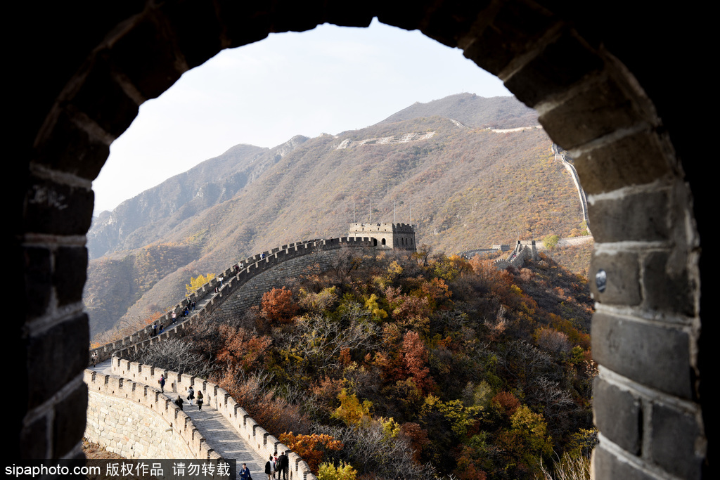 Each window of the Great Wall offers a unique angle. On the south side of the second floor of Badaling, the nearby hillside unfolds before your eyes, displaying a wealth of vibrant colors from the surrounding forest. Amidst the myriad shades, the golden leaves of the sweetgum trees stand out, resembling scattered crimson clouds.