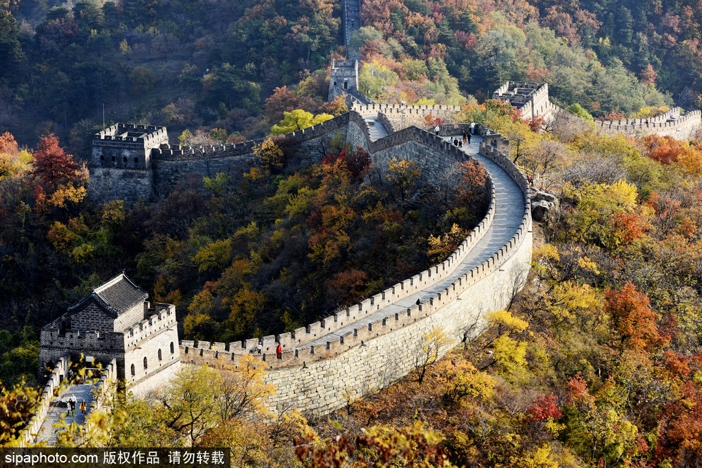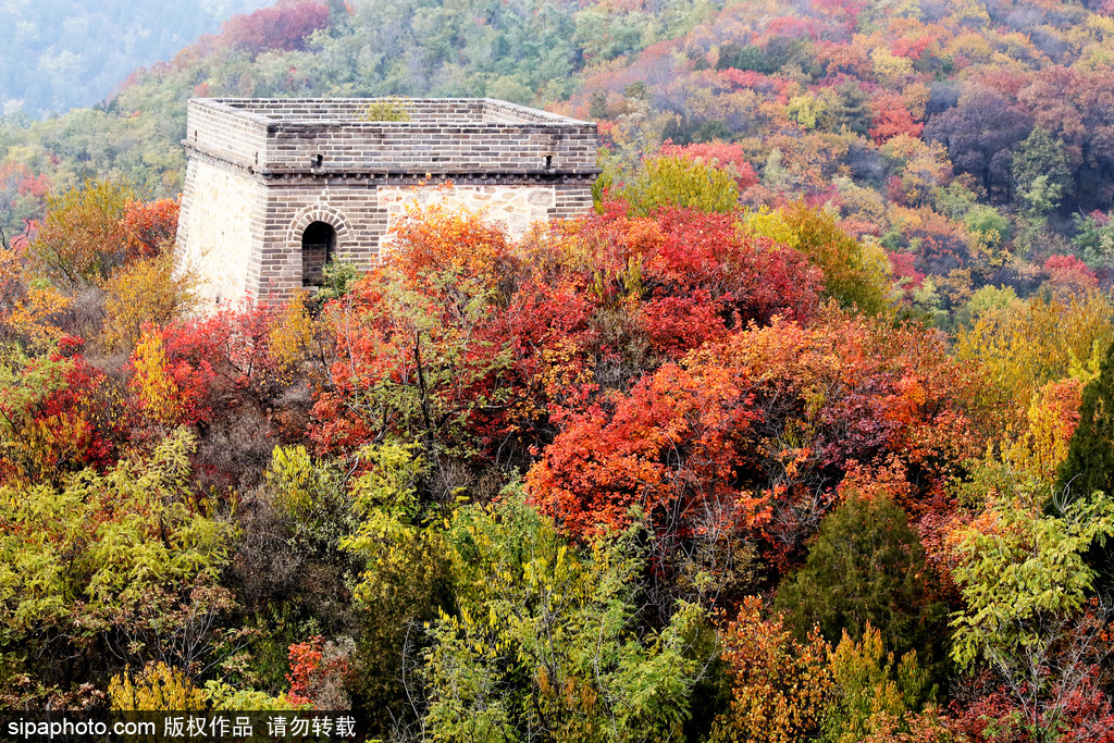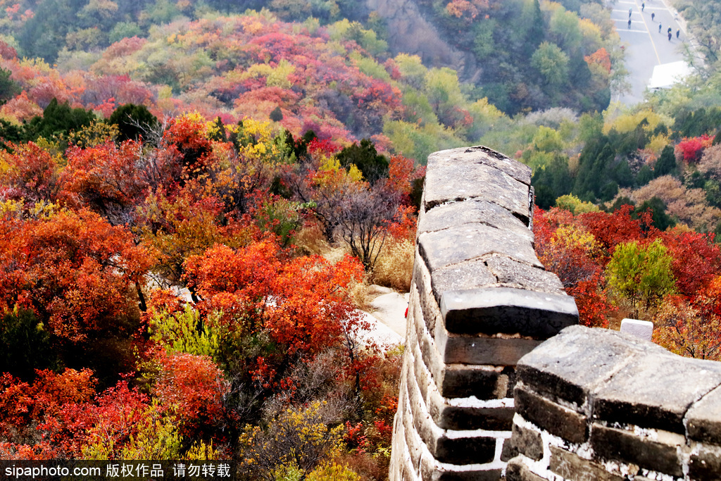 In the golden autumn season, Mutianyu Great Wall features a 3,000-meter-long stretch of gradually changing red leaves. The red leaves, set against the magnificent backdrop of the Great Wall, paint a picturesque autumn scene.
