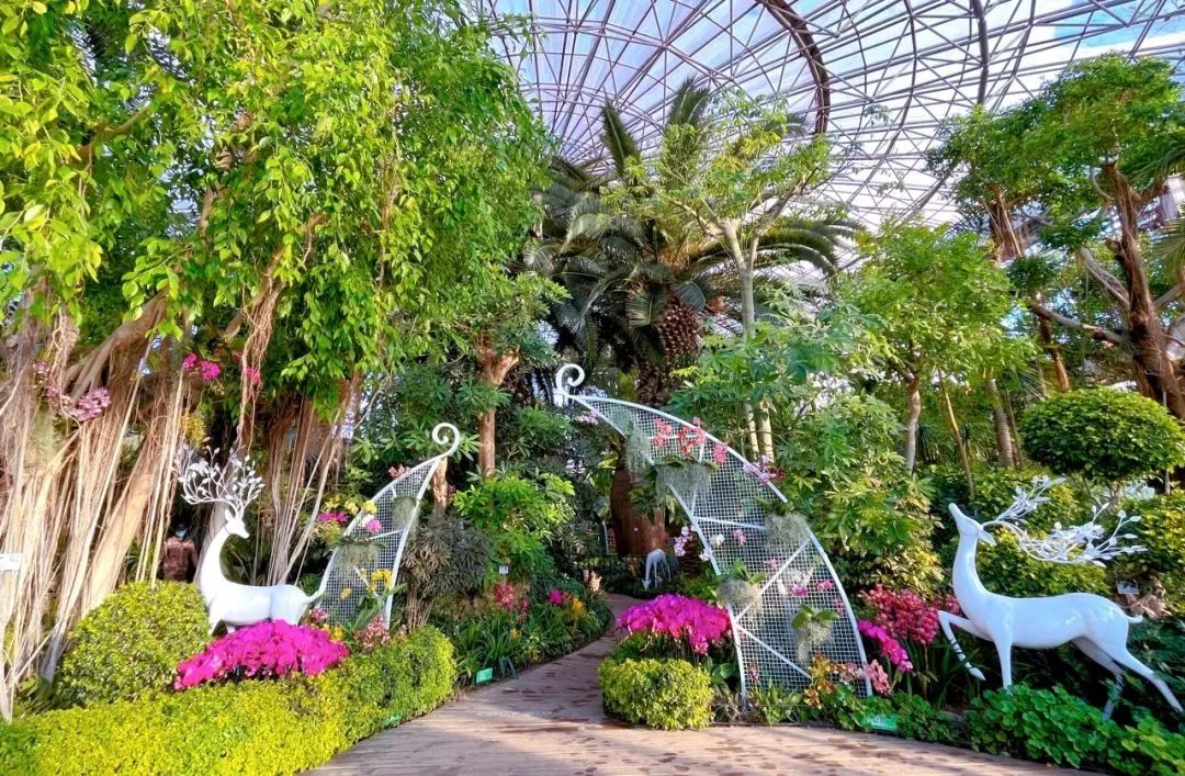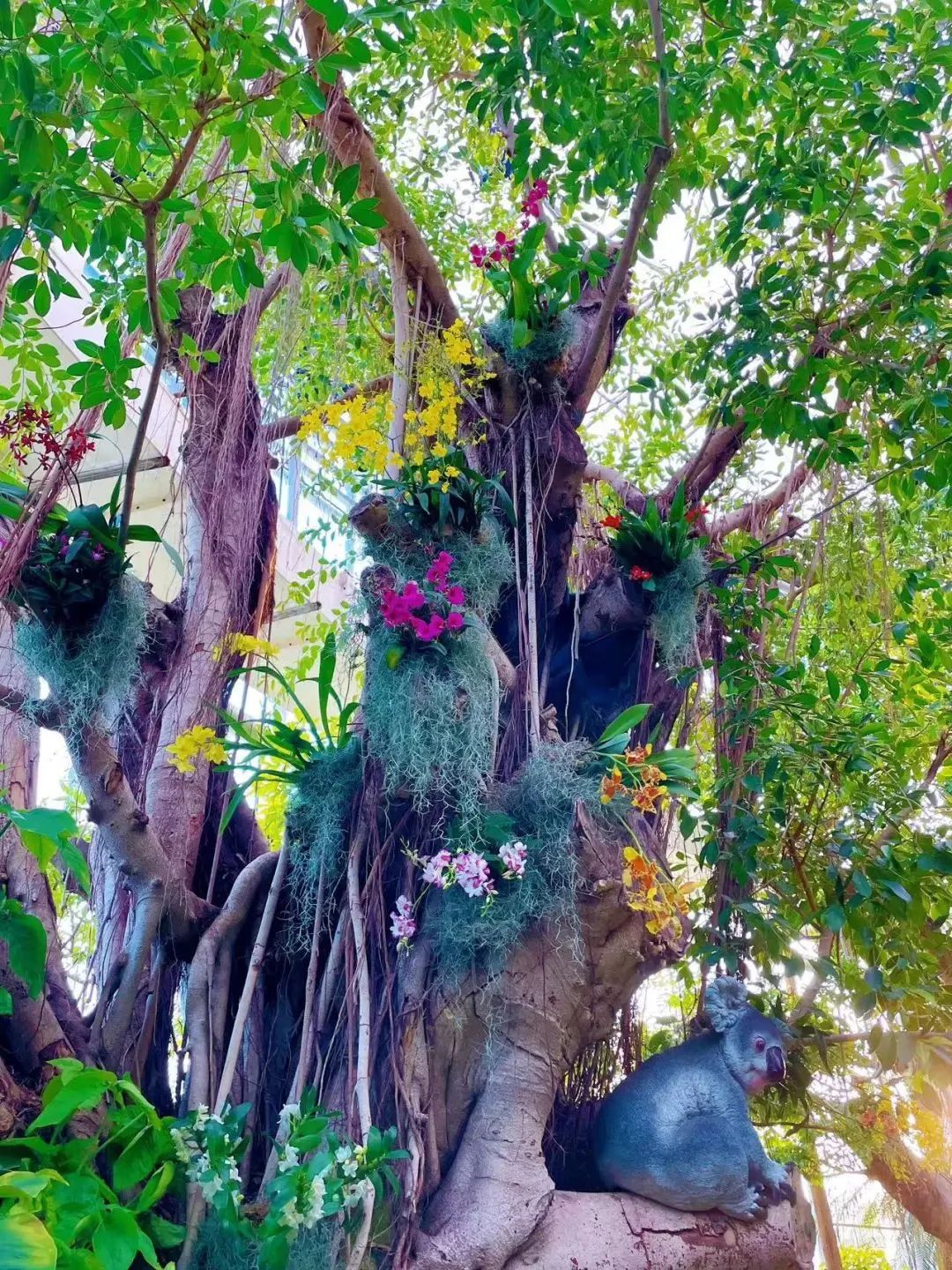 In addition, the park imitates the tropical rainforest landscape by displaying dozens of epiphytic orchids, decorating them on banyan trees with varieties like catteleya and vanda, and using moss-covered pineapples for decoration, forming the landscape of the "Sky Garden."