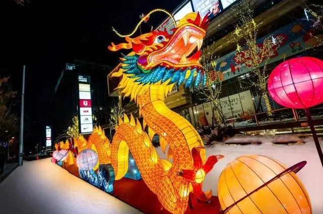 In Fengtai District, many commercial districts have already completed their "makeover" for the Year of the Dragon. At Fengtai Joy Breeze, a 20-meter-long giant dragon lantern has "descended," shining brightly at night. Additionally, large dragon lanterns spiral above the square and corridors, intertwining in the night, bringing blessings for the Lunar New Year.