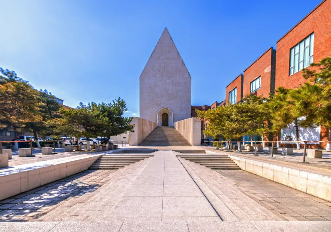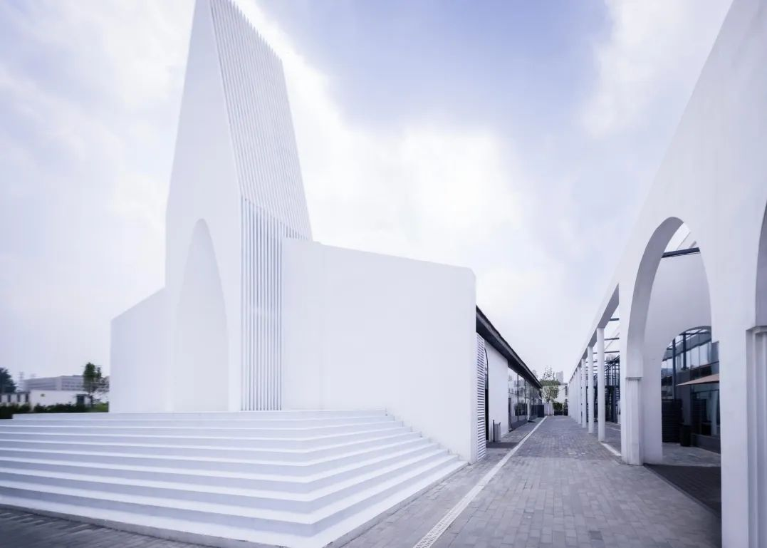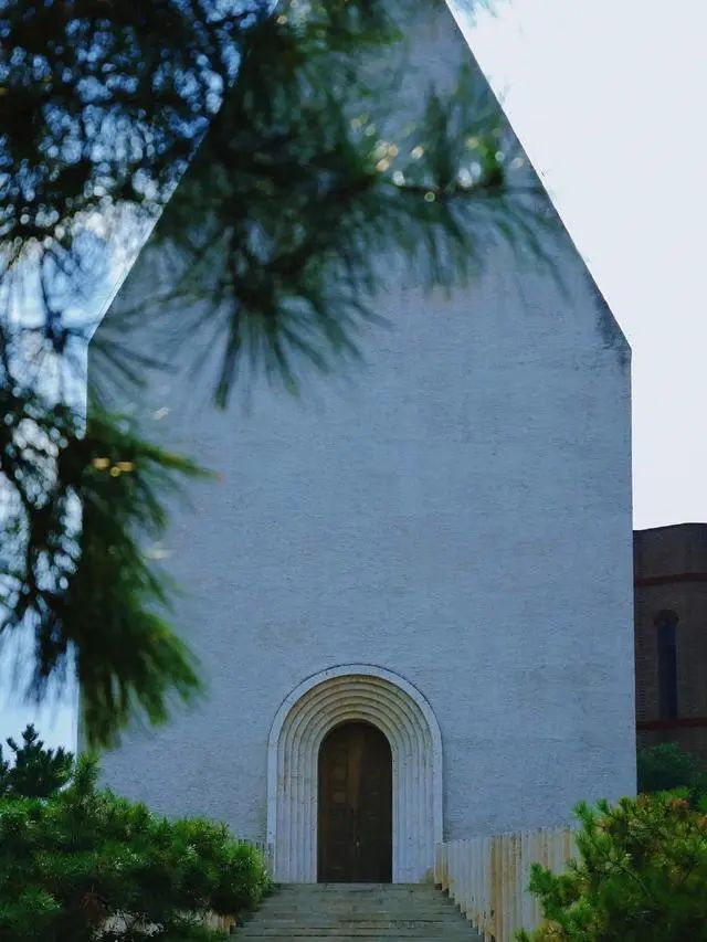 The iconic building within the Academy is a milky-white church with gently ascending stairs and a triangular roof. It features a minimalist design, free of excessive patterns and intricate decorations.