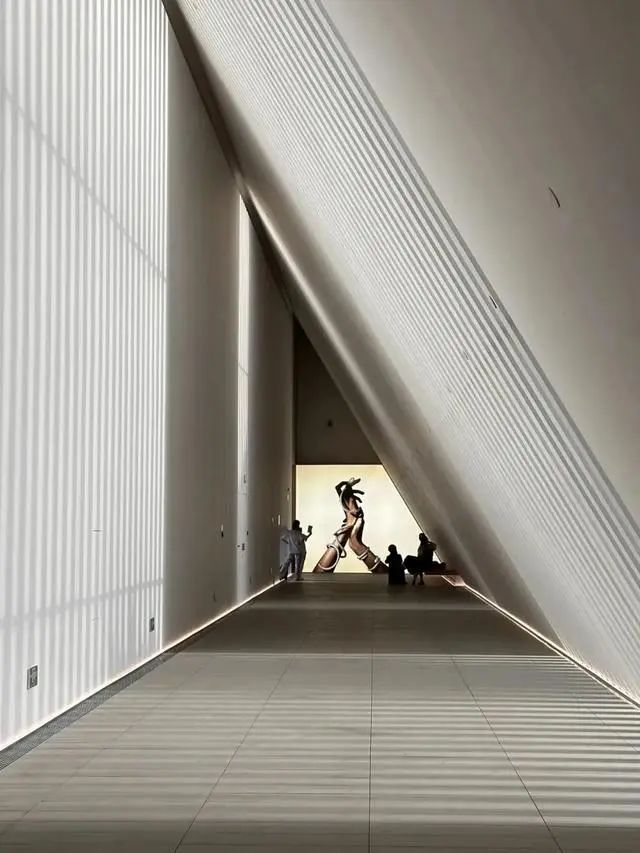 Beijing Qihao Art Gallery, designed by renowned architect Tadao Ando, features an exposed concrete exterior resembling a pristine lotus flower, perfectly blending with the surrounding natural environment. It quietly blooms on the banks of the Liangma River in Chaoyang, Beijing. The overall architecture has a sharp geometric design with a long corridor at the entrance. In the afternoon, sunlight streams through the windows, casting dreamy patterns on the floor.