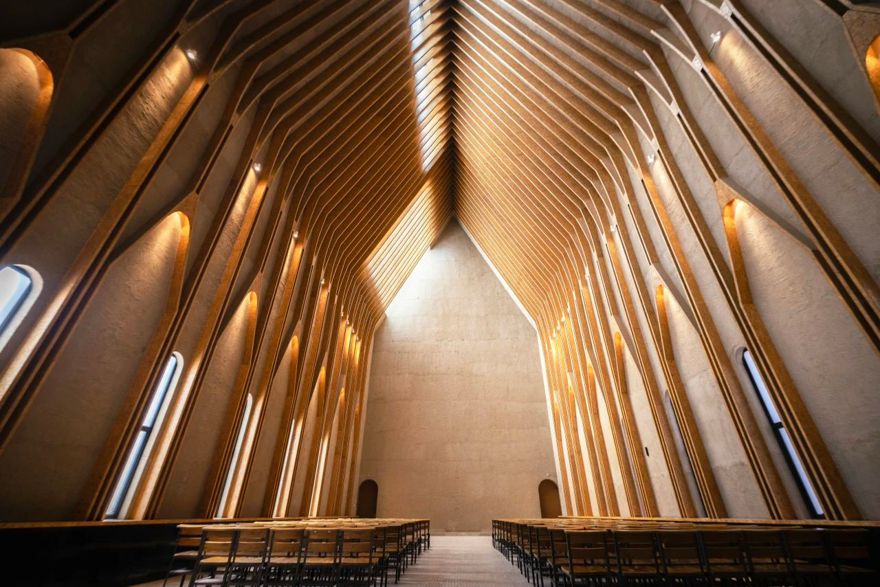 The walls of the church have a natural texture, resembling a clean, understated canvas. The interplay between the architecture and light creates a beautifully textured aesthetic.