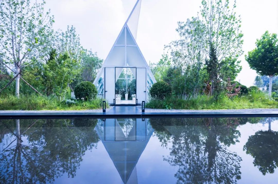YORY Banquet Center is a stunning and glamorous art landmark. The white building harmoniously complements the surrounding greenery.