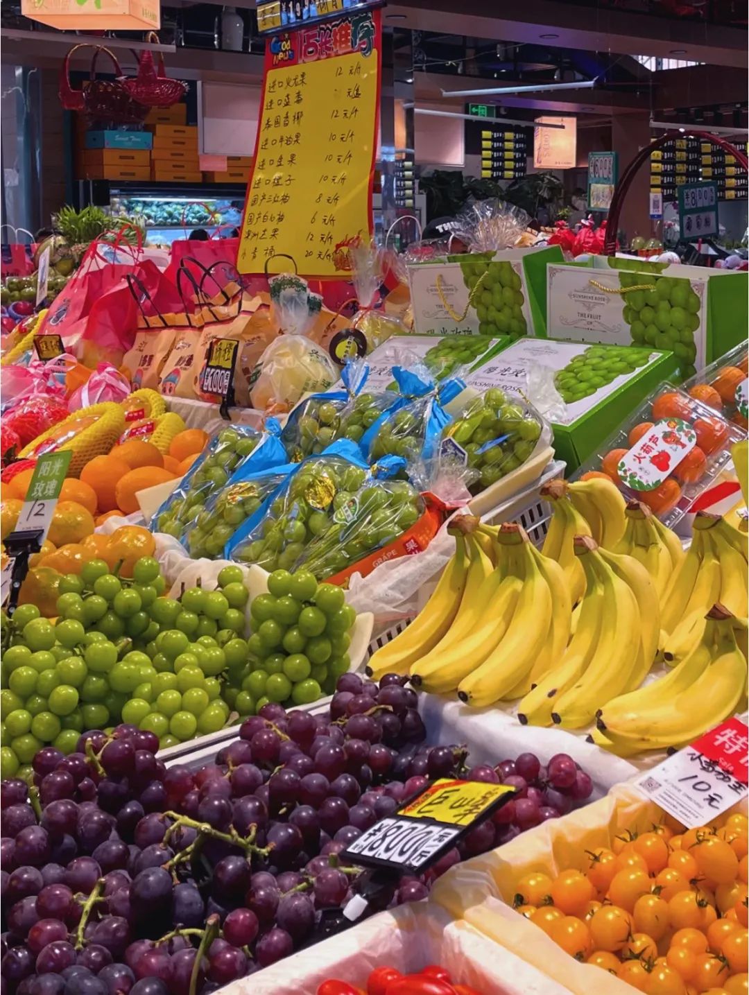 The market is bright and clean, with well-arranged fresh vegetables. In the middle are fruit and vegetable stalls, with individual stores on both sides offering all sorts of things from fresh groceries to daily necessities and life services.