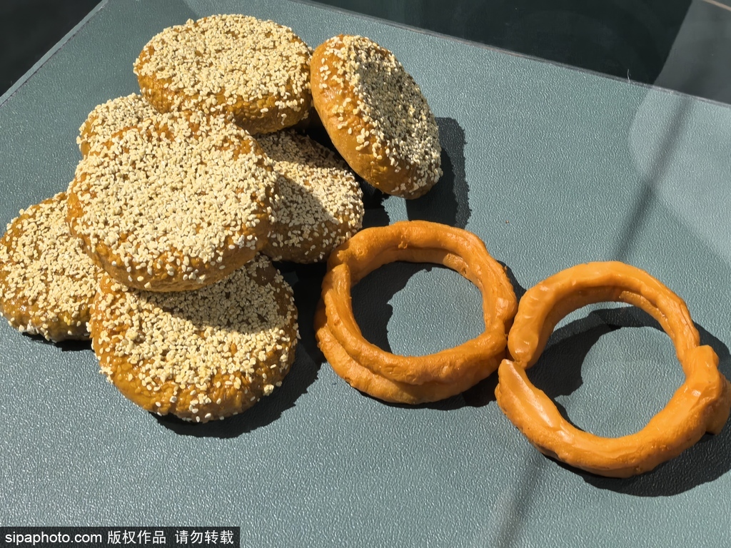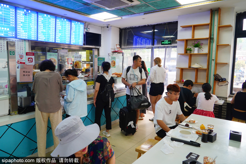 Most customers are regulars who order without the menu. In the bustling kitchen, activities abound - from pressing douzhi and baking cakes to serving dishes. Despite its limited space with just around ten tables, the shop is always packed. Customers queue from the counter to outside the shop, carrying their food to find a seat. It is quite common for them to share tables with strangers.