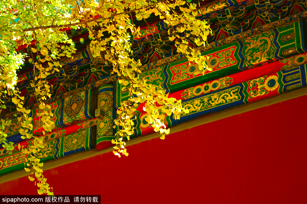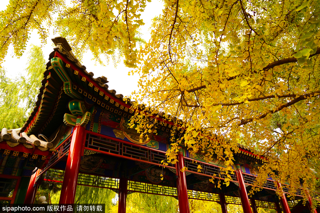 In Zhong Shan Park, between the South Gate of Zhong Shan Park and Imperial Divine Temple, lies a ginkgo avenue. This avenue features 18 ginkgo trees, each around 50 years old with trunks measuring 30 to 40 centimeters in diameter. In late autumn, the leaves of these towering ginkgo trees turn a brilliant golden yellow. As the autumn wind blows, the leaves flutter like butterflies, spinning gracefully in the air before gently falling to the ground, creating a golden carpet. In Zhong Shan Park during autumn, the golden ginkgo leaves, silver maples, and horse chestnuts, as well as the red leaves of the Chinese maple and the silk cotton tree, create a vivid tapestry of autumn colors. Against the backdrop of the red walls and glazed tiles, the scenery is particularly enchanting.