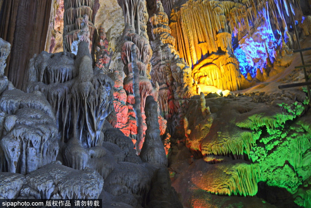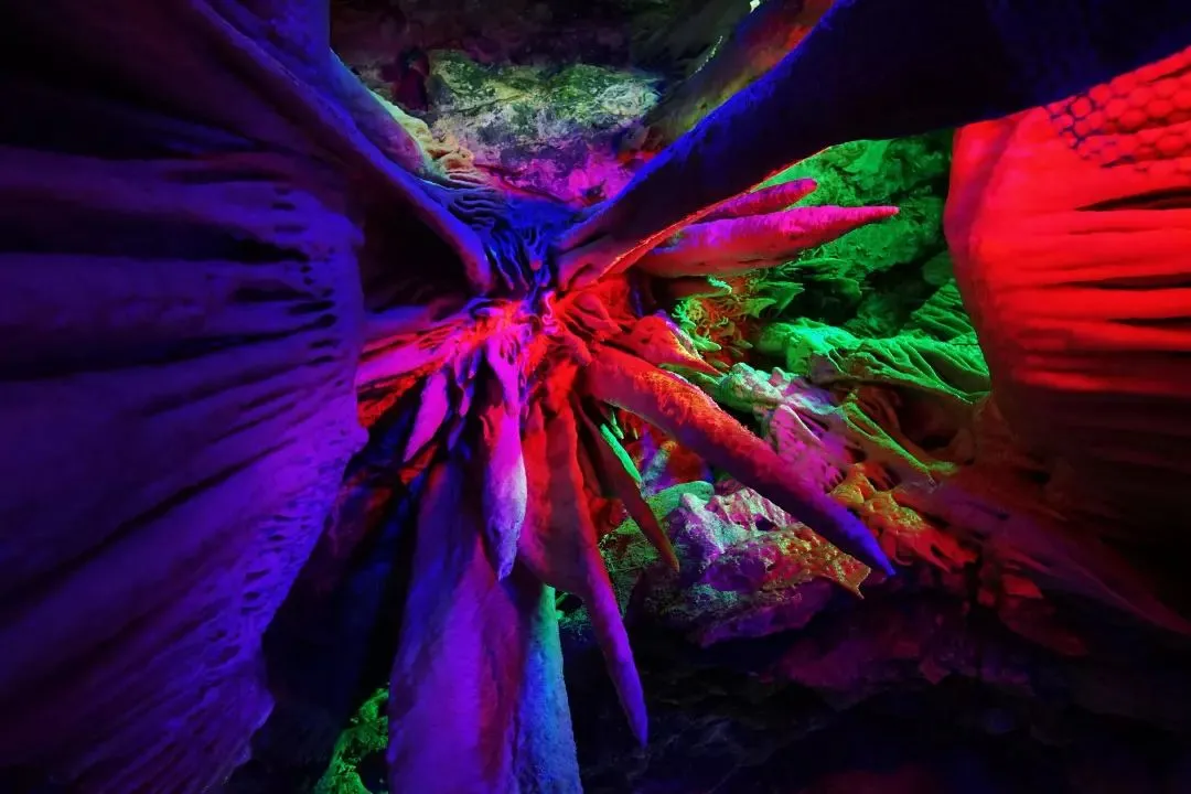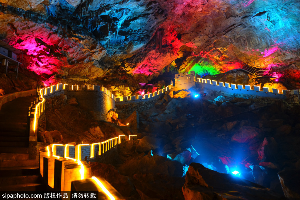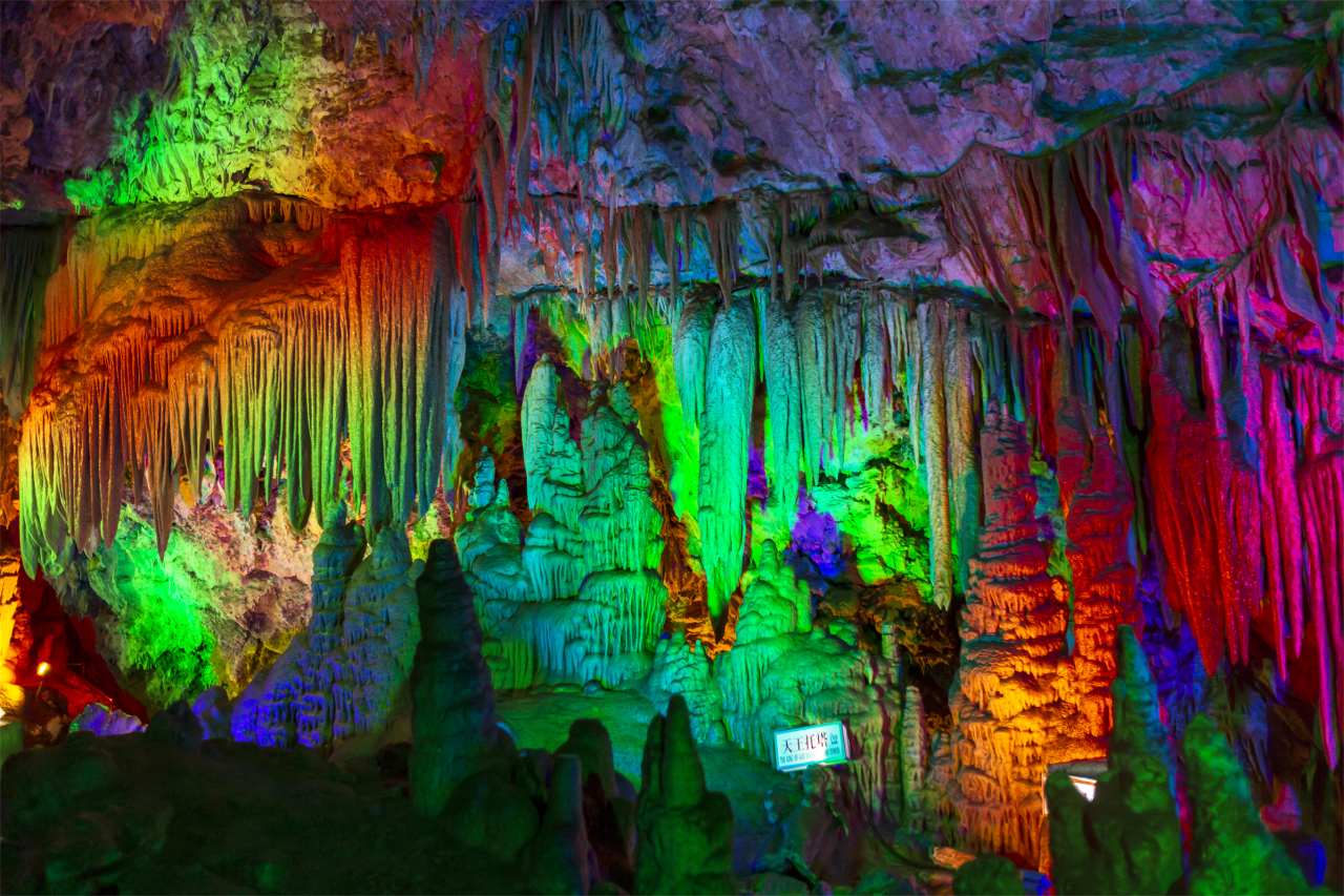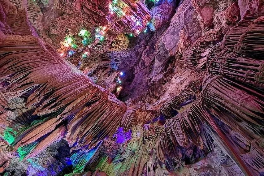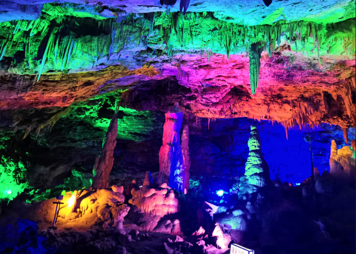 The cave is divided into upper, middle and lower three layers, mainly with ‘Tongtianzhu’, ‘Qin Board’, ‘joy of family’ and other landscapes, with various stalactites standing in different shapes and vivid images like an art palace. The most shocking scene is the 98-meter Xianqi Hall, where the colorful lights on the roof of the cave are like the starry sky which is quite amazing.