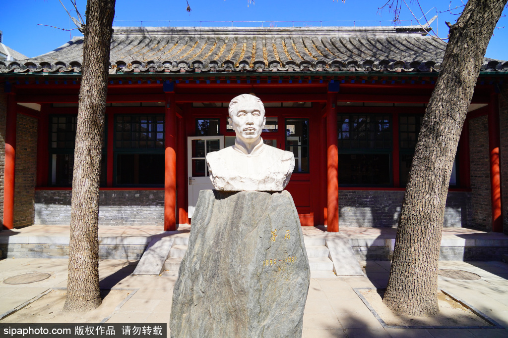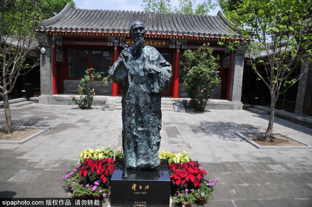 The former residence of Qi Baishi is a quintessential Beijing siheyuan, a courtyard house that faces south and is nestled in the heart of the city. During the midsummer season, the verdant trees and their rustling branches create a tranquil environment. Within the serene courtyard, one can observe a crabapple tree, a pomegranate tree, two magnolias, and two rose bushes, casting a mottled shade on the ground. In the courtyard's center stands a life-sized statue of Mr. Qi Baishi, leaning on his cane amidst the lush magnolias, gazing intently into the distance.