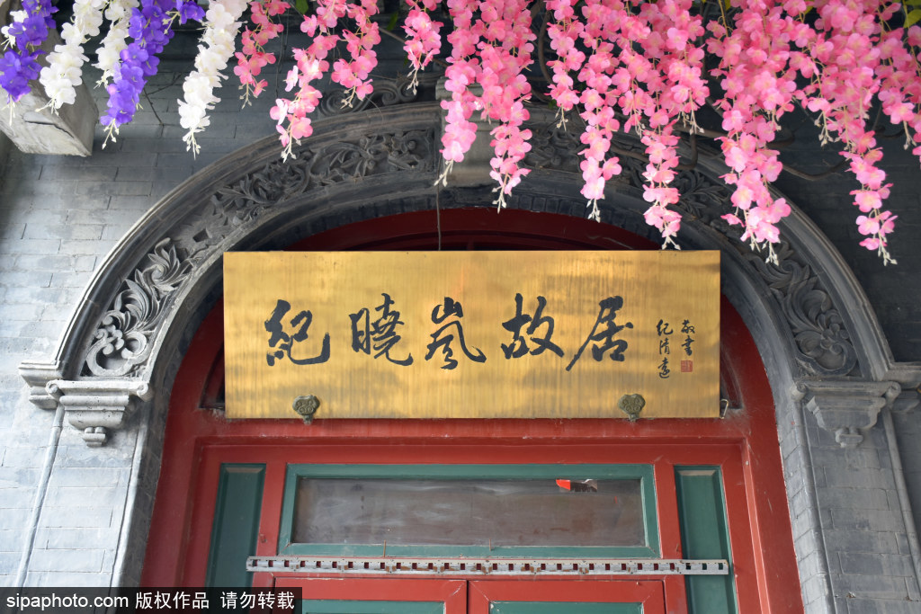 The existing structure of Ji Xiaolan's Former Residence reflects traditional Qing Dynasty architecture, characterized by brick and wood, with a layout oriented from north to south, approximating a two-entry courtyard house, or siheyuan, covering an area of 1,570 square meters. The main entrance, embellished with auspicious designs and topped with a hard mountain gate tower, is positioned at the southeast corner of the property. Adjacent to the south wing and to the west of the gate, lie four "inverted seat" rooms that open to the exterior. A wisteria vine stands in the front courtyard, believed to have been planted by Ji Xiaolan himself, which still flourishes, offering a dense shade. The primary building in the rear courtyard, "Yuewei Caotang," contains a screen in the middle of the northern hall side, with a horizontal plaque inscribed with "The Former Site of Yuewei Caotang," personally signed by Mr. Qi Gong.