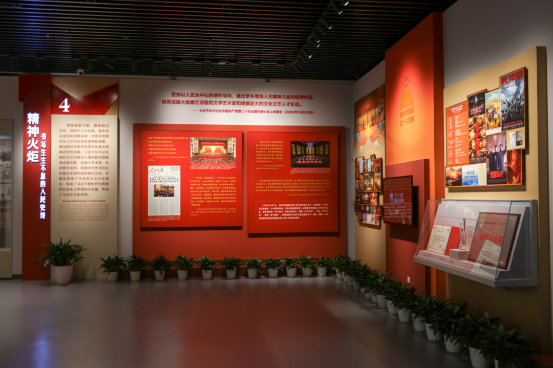 The exhibition covers an area of approximately 800 square meters, showcasing over 170 pictures and more than 230 pieces/sets of cultural relics. It is divided into a preface and four parts, namely: preface; literary and artistic war drums: drums and shouts for the liberation of the whole China; remove the old and renovate the new: take over and transform old literature and art; create a new landscape: build the four beams and eight pillars of new Chinese literature and art; and spiritual torch: write an endless people's epic. It aims to comprehensively review the tireless exploration of the literary and artistic undertakings by the Communist Party of China since the May Fourth New Culture Movement.