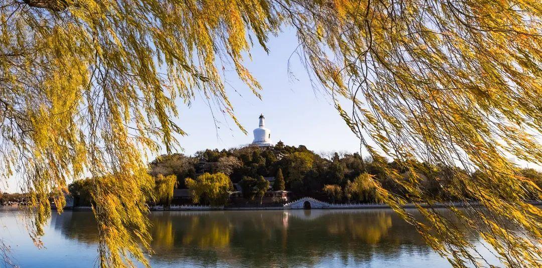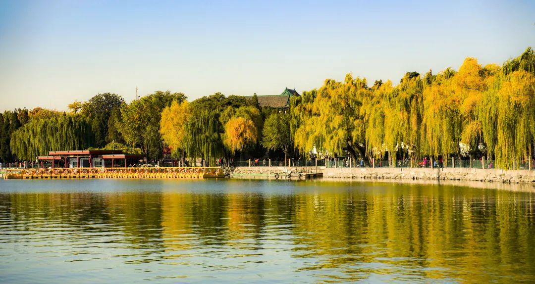 The park's iconic willows surrounding the lake gradually transition from green to golden yellow, creating a stunning visual harmony with the surrounding ancient architecture. This vibrant color change offers a rich palette and distinct layers, enhancing the beauty of the scenery.