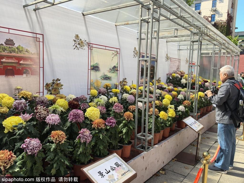 The site of the Wanfo Pavilion features a display of specimen chrysanthemums, showcasing over 20 chrysanthemum works submitted by various chrysanthemum associations. The exhibition also includes traditional Chinese specimen chrysanthemum varieties from Beihai Park and newly developed varieties. The exhibition will continue until October 18.