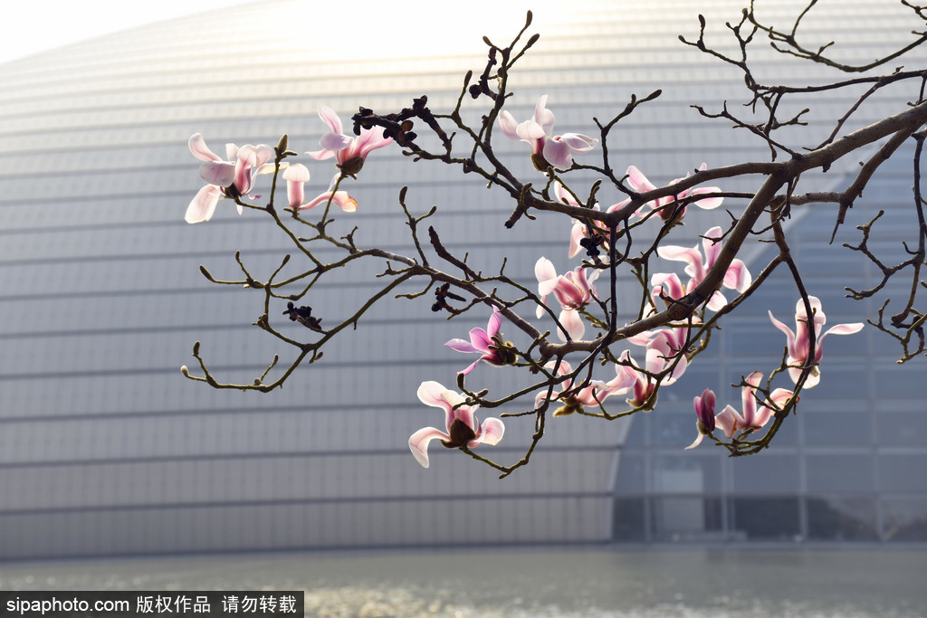The northwest corner of the National Centre for the Performing Arts also features a patch of purple magnolias, creating an interesting interplay between the blossoms and modern architecture. At night, the various light shows at the theater enhance the magnolias' unique charm.