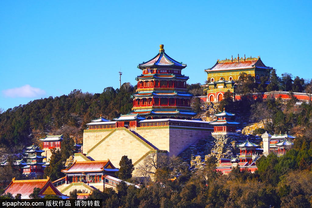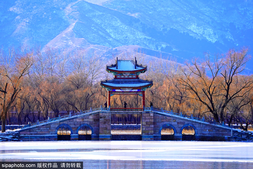 Entering through the South Ruyi Gate, crossing the tall stone arch bridge, and heading north along the West Causeway, you pass Lian Bridge, Liu Bridge, Jing Bridge, Yudai Bridge, and Binfeng Bridge. The snow-covered Summer Palace looks stunning, with the pagoda of Yuquanshan and the Buddhist incense hall of Wanshou Mountain shrouded in a blanket of white, appearing even more majestic.