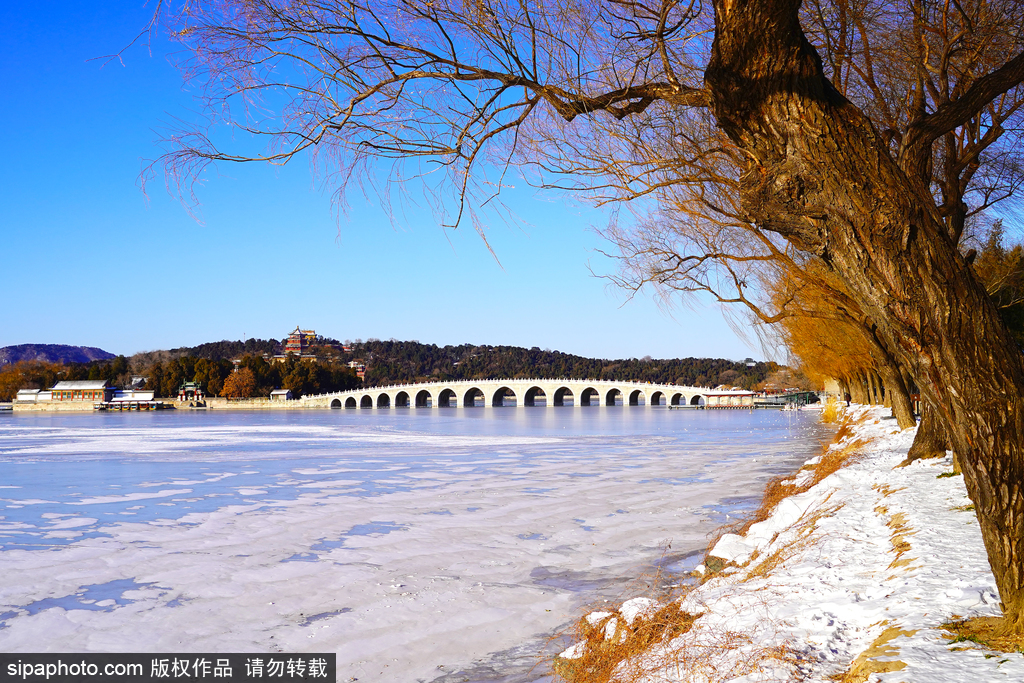 How beautiful is winter at the Summer Palace? I know of three moments: one is around the Winter Solstice when the sunset casts golden rays from the southwest, illuminating the Seventeen-Arch Bridge. Standing on the small island at the west end of the bridge, you can witness the spectacular sight of golden sunlight streaming through all seventeen arches. Another moment is when snowflakes gently fall, covering Kunming Lake in white. The last is the tranquility and comfort of a clear morning after snow, walking along the West Causeway.