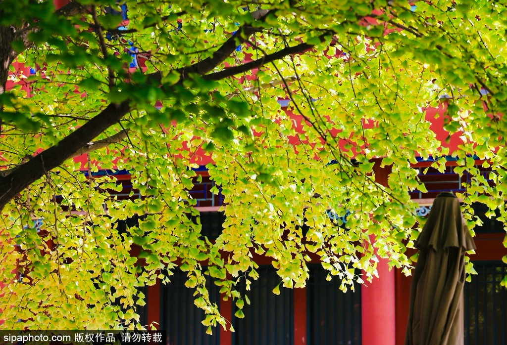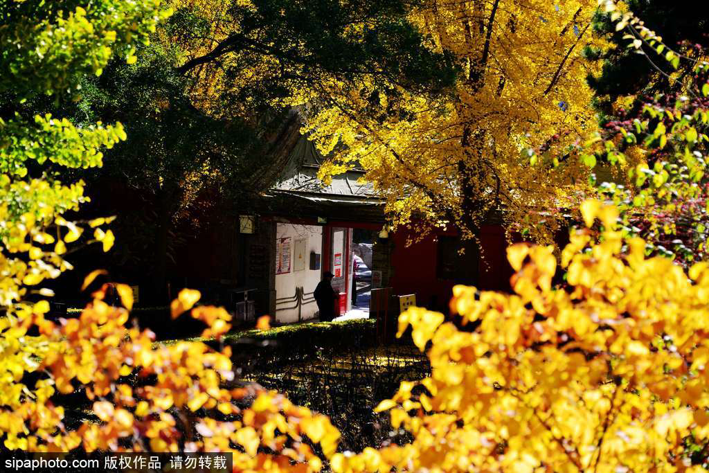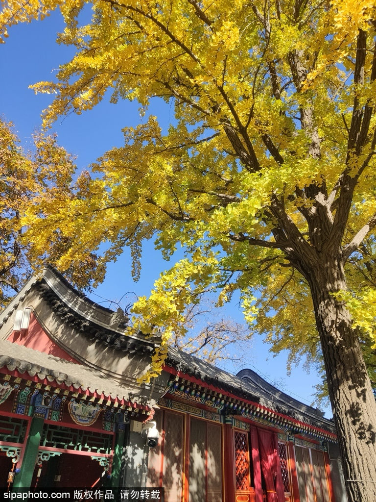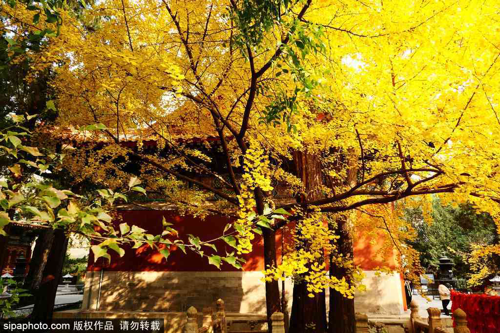 Currently, these ancient ginkgo trees are surrounded by clusters of golden leaves. When the sunlight filters through the dense branches and leaves, reflecting off the red walls, the interplay of light and shadow creates a stunningly beautiful scene.