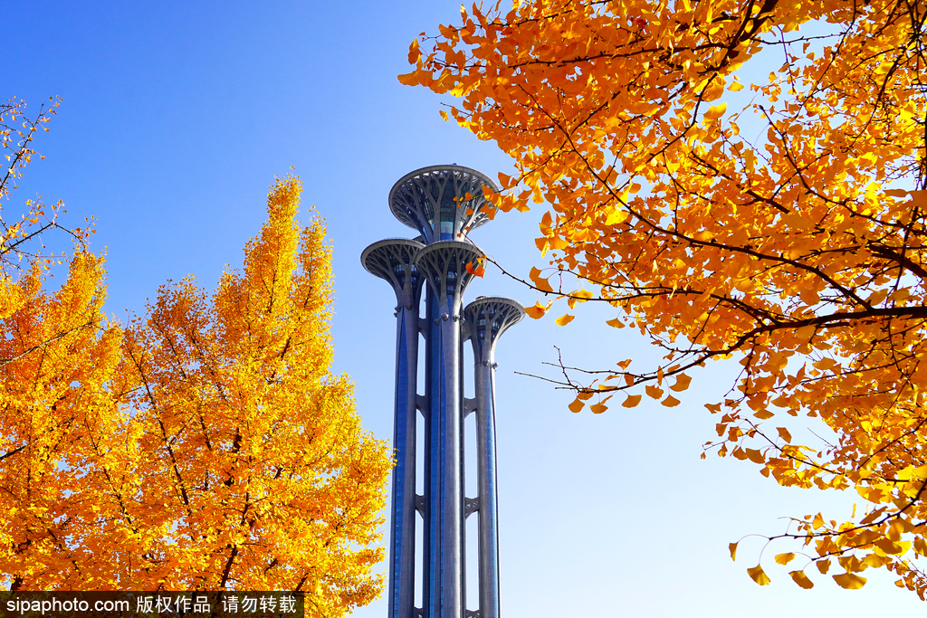 The ginkgo trees in Olympic Forest Park turn yellow earlier, with a blend of yellow and green, creating a unique beauty that may transform into a sea of gold after a night of autumn winds.