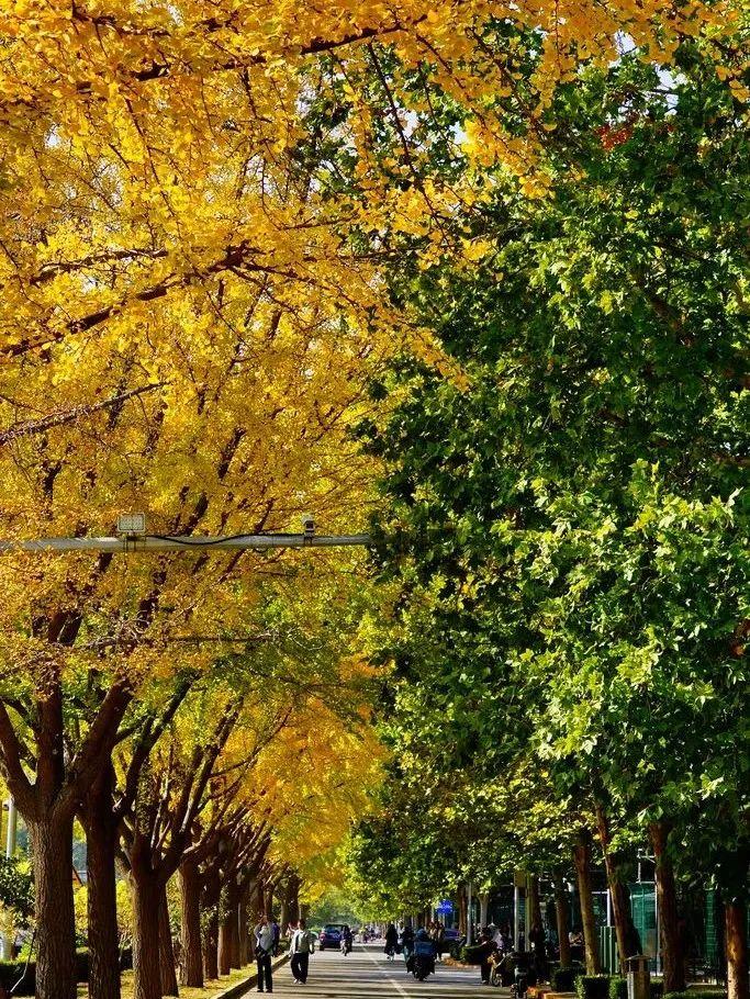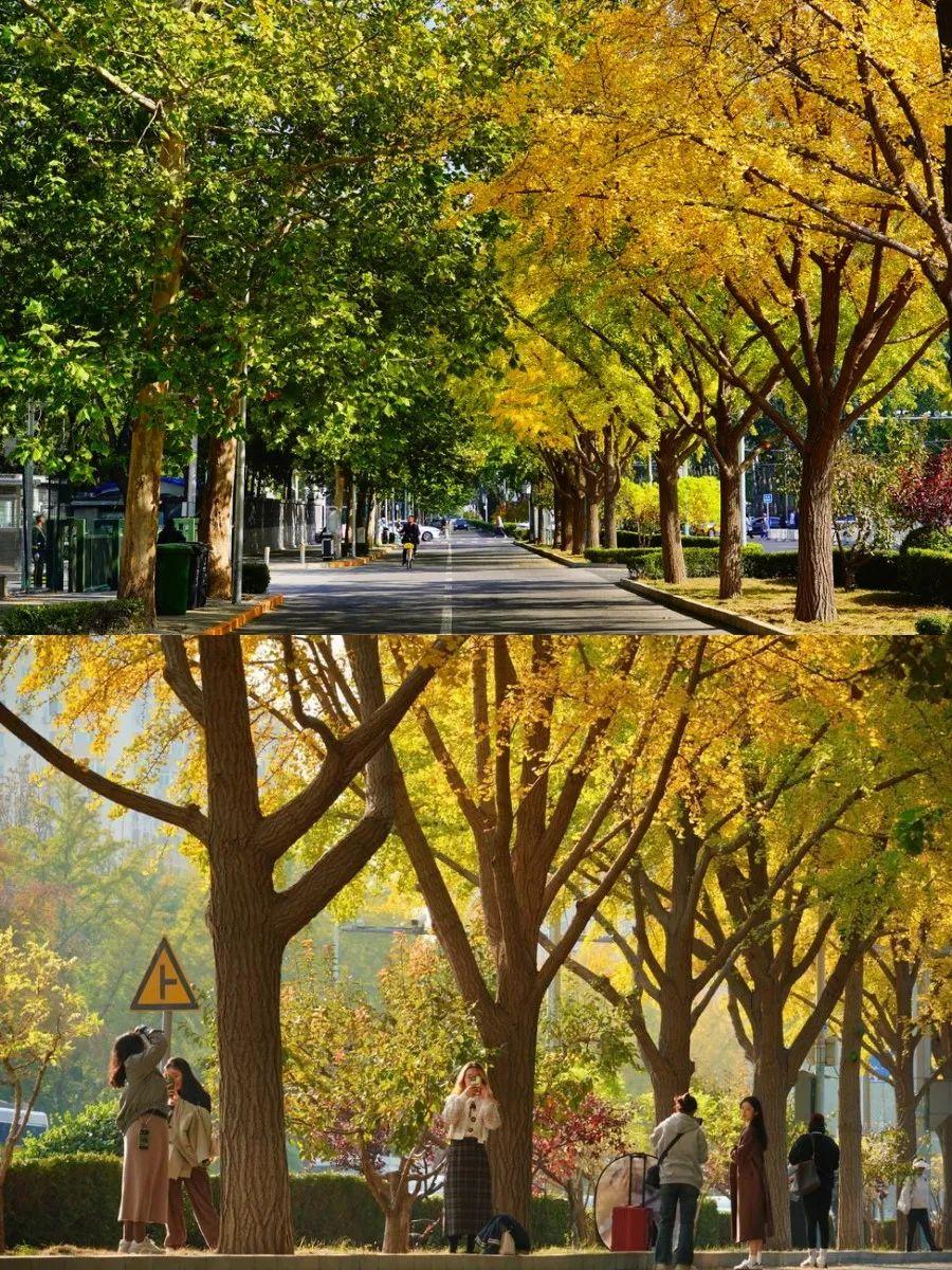 On Dongzhimennei Street, the ginkgo trees are adorned with brilliant golden leaves, while a row of plane trees stands lush and green. The interplay of yellow and green creates a scene that perfectly exemplifies "equal division of autumn colors," showcasing a unique juxtaposition of "one half summer, one half autumn." This vibrant contrast highlights the beauty of seasonal transitions.