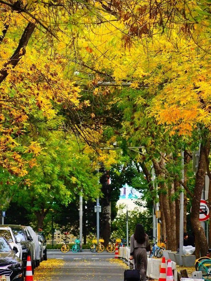 In Sanlitun Xiwu Street, the autumn atmosphere is in full swing. The leaves of the white wax trees have mostly turned a brilliant gold, making the city's hustle and bustle feel pleasantly distant. In its place is a serene elegance that invites relaxation and contemplation.