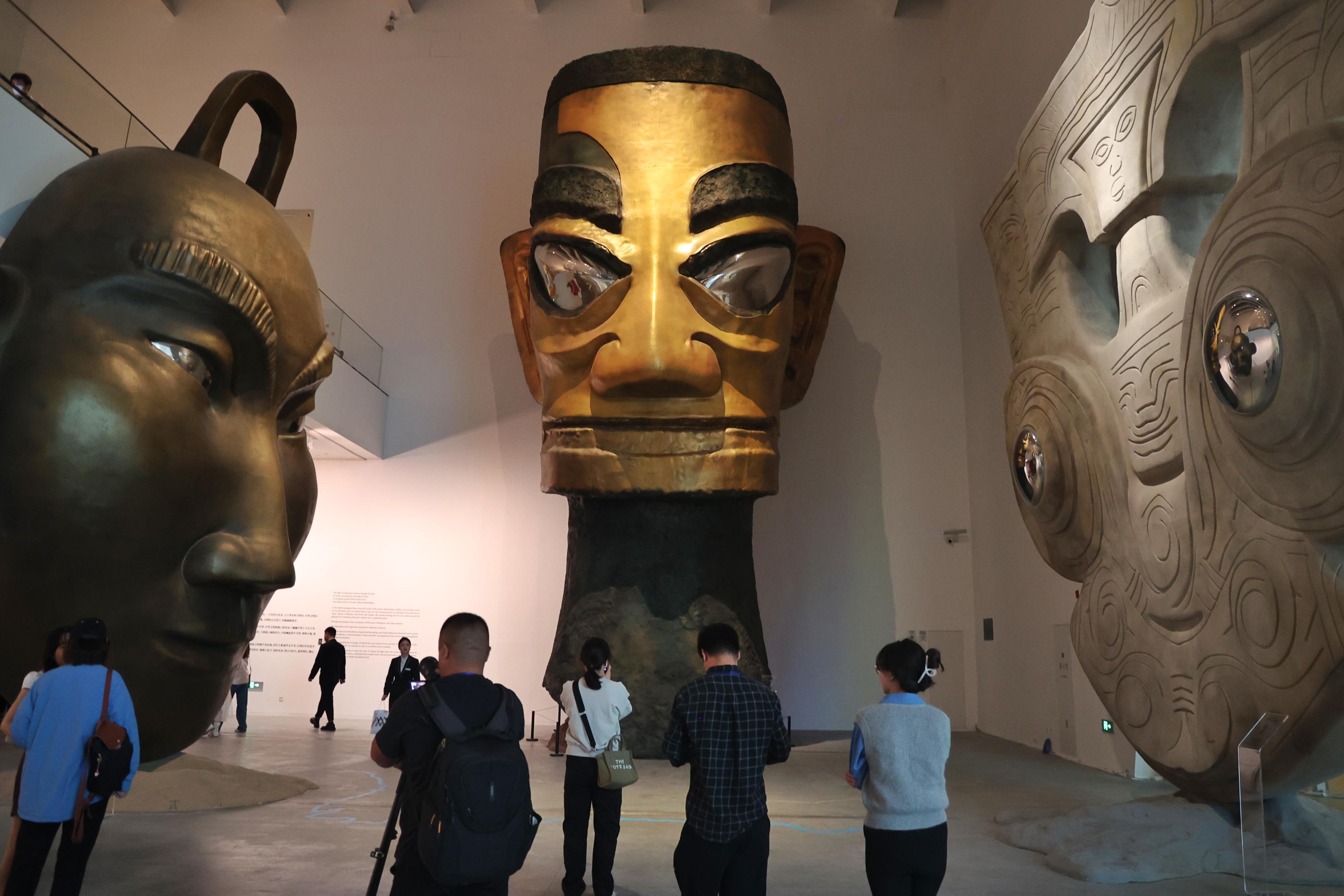 Entering the exhibition hall, under the gaze of three huge masks representing Liangzhu, Yinxu, and Sanxingdui ancestors, visitors can't help but feel a sense of pride. The history of Chinese civilization in the pre-Qin era is not just myths and legends, the Three Sovereigns and Five Legends recorded in ancient books, but is revealed, restored, and proven step by step through archaeology, supplemented by field excavations. The art museum designed the eye parts of the three ancestors' masks as reflective mirrors, and when visitors look at them, they can see themselves in their eyes, as if standing in the ever-flowing historical space at the same time, and their gaze leads visitors to the civilization sites of Liangzhu's Waterborne Kingdom, Yinxu's Bronze Age, and Sanxingdui's star-studded divine country.