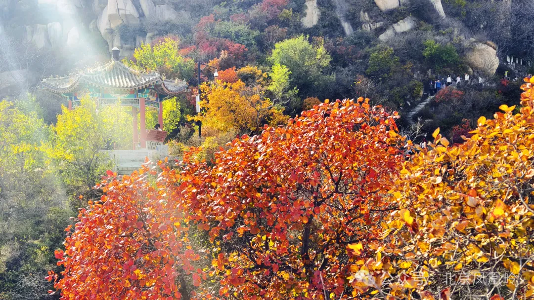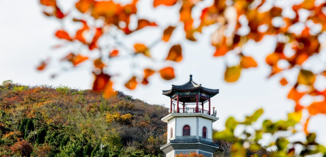 During the golden autumn season, the colorful foliage at Baiwang Mountain Forest Park has reached its peak viewing period, expected to last until mid-November. The Friendship Pavilion is one of the best observation areas, where the yellow poplar trees have nearly turned completely red, attracting numerous visitors for photos and check-ins.