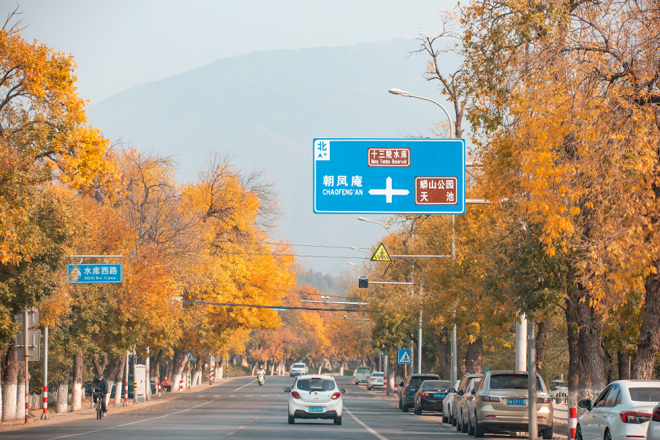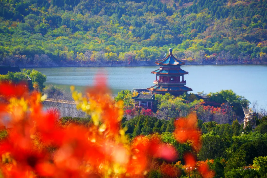 The Ming Tombs Reservoir is a picturesque destination on the outskirts of Beijing. In late autumn, it bursts with vibrant colors, attracting visitors who come to enjoy the scenery.
