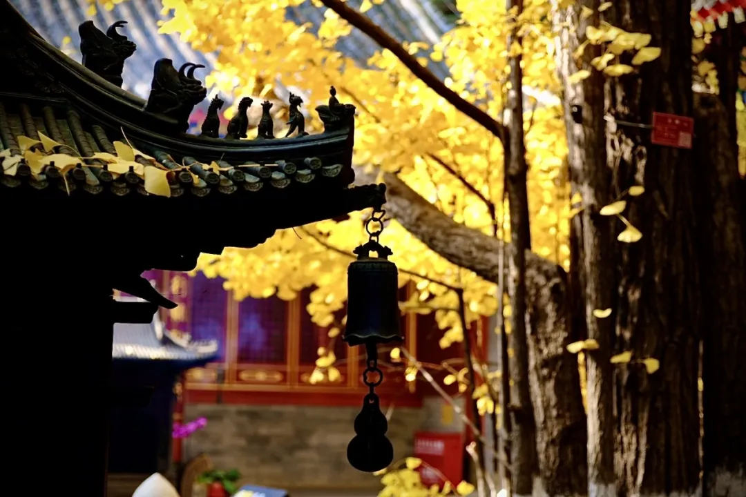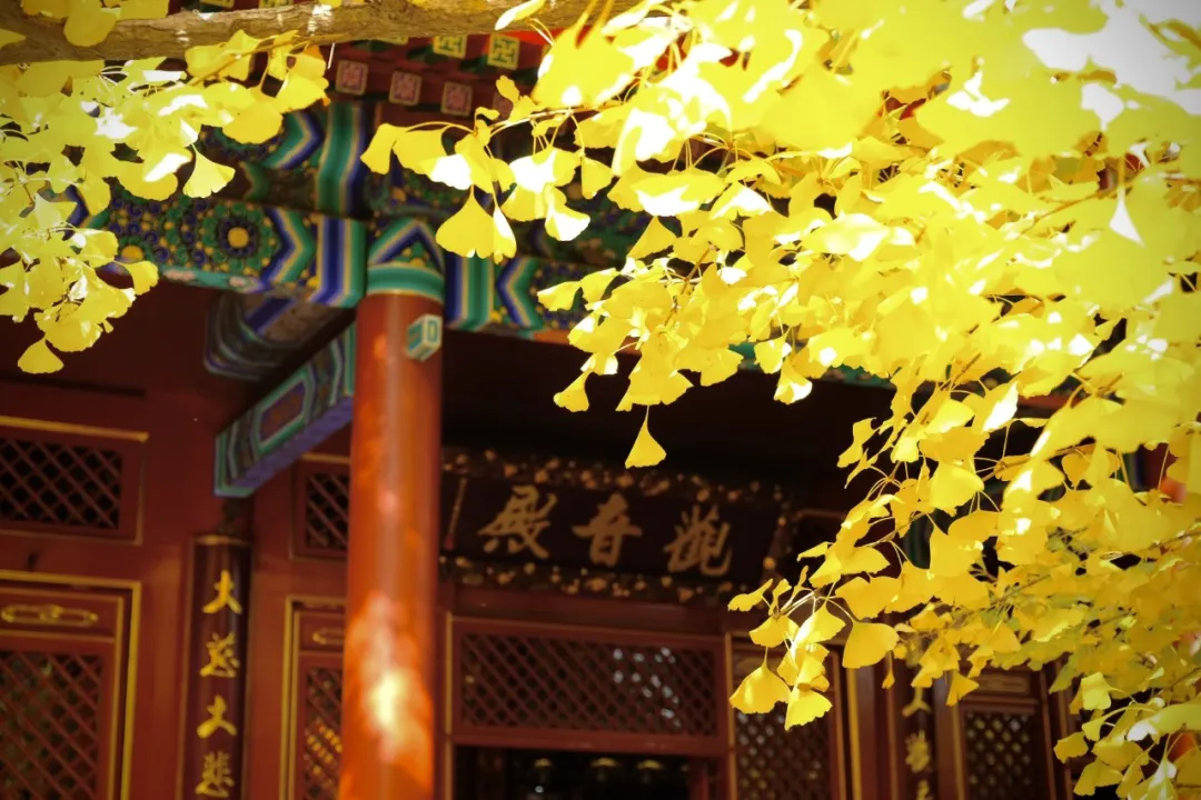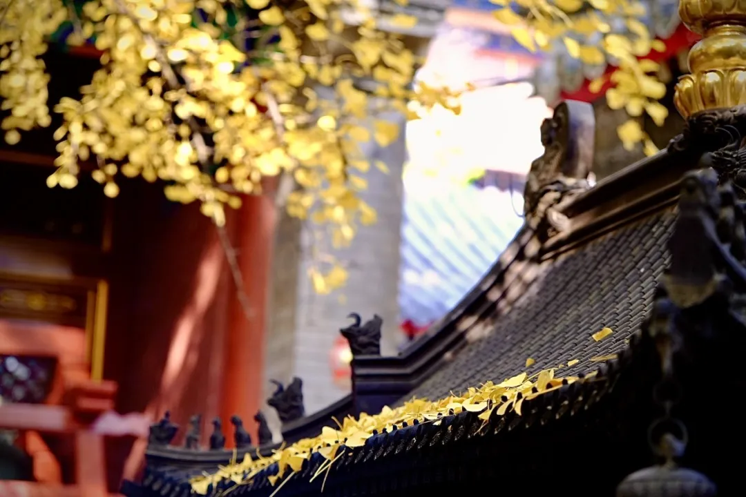 The ginkgo trees around the Guanyin Hall are adorned with brilliant golden leaves, perfectly complementing the ancient architecture and attracting numerous visitors to take photos.