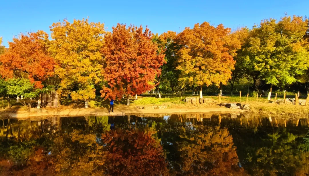 In late autumn, the Beijing Garden Expo Park is filled with vibrant scenery. As you stroll through the park, the rich autumn atmosphere is everywhere. The trees have donned their new attire, intertwining shades of golden yellow, lush green, and fiery red, creating a breathtaking view.