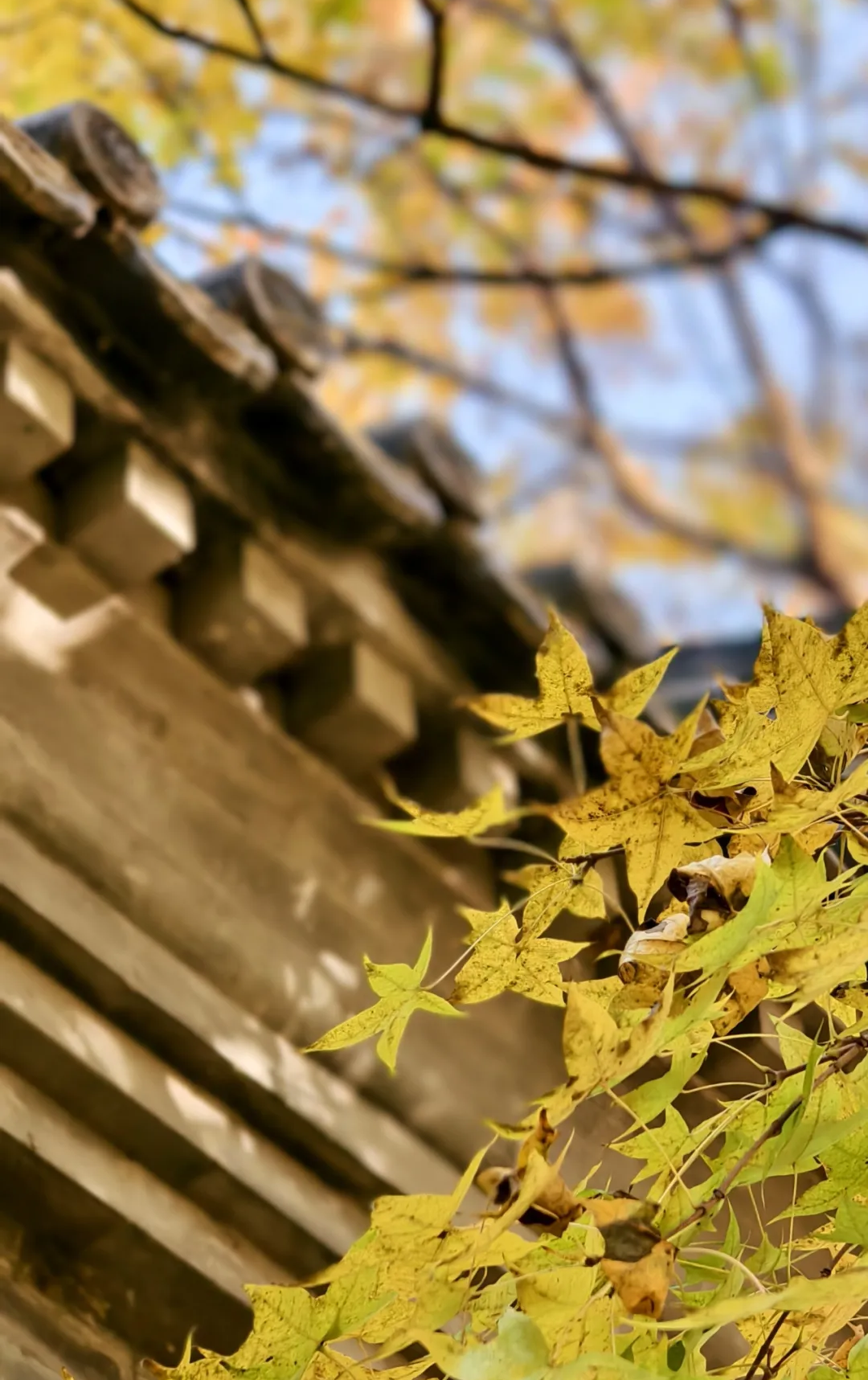 The lake near the ancient residences appears especially tranquil under the warm autumn sun. The surface of the water reflects the vibrant colors of the surrounding trees, resembling a static oil painting.