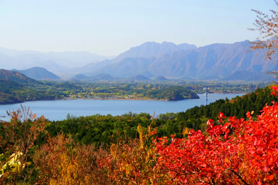 Standing at a high point of the Ming Tombs Reservoir, you can gaze into the distance and see fiery red leaves dotting the lush green mountains, resembling a carefully arranged autumn feast by nature.