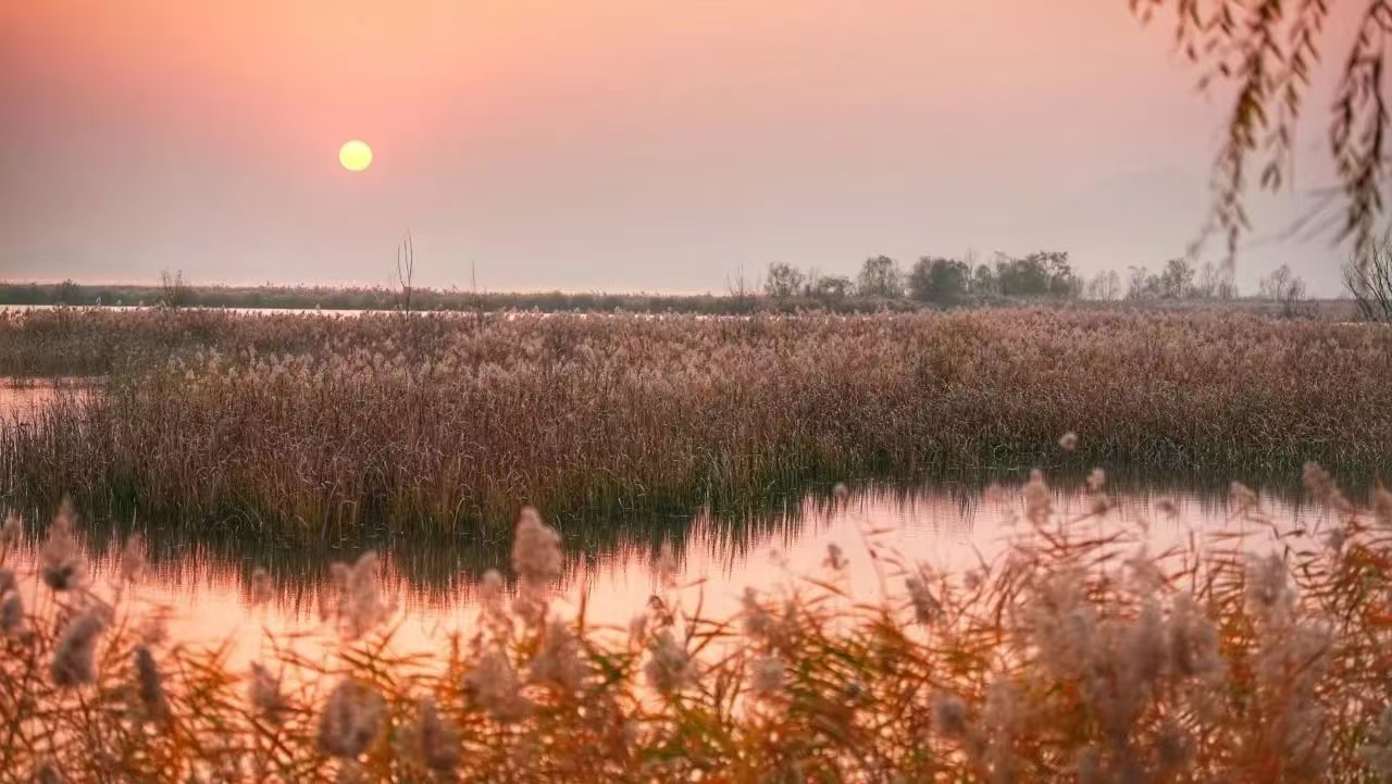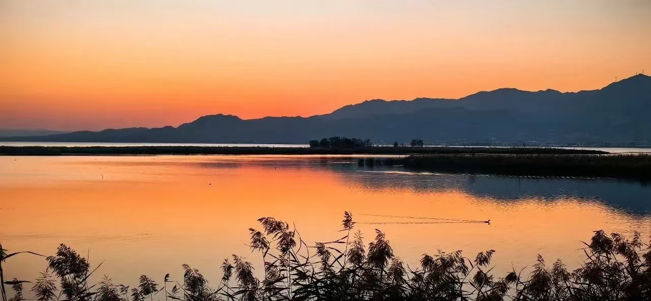 In autumn, Yeya Lake is adorned with the gentle dance of reed flowers and the swaying of Miscanthus flowers, offering a view of the vast expanse described as "reed catkins are green, and dew turns to frost," and the vibrant scene of "sunset and solitary ducks fly together, autumn waters blend with the sky."