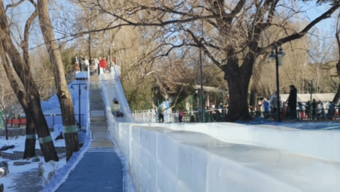 The ice slide, priced at 10 yuan, is 6 meters high and 70 meters long, with a clear, glittering track. Visitors can speed down the slide and experience the thrill of high-speed descent.
