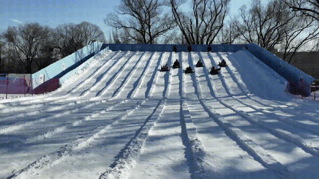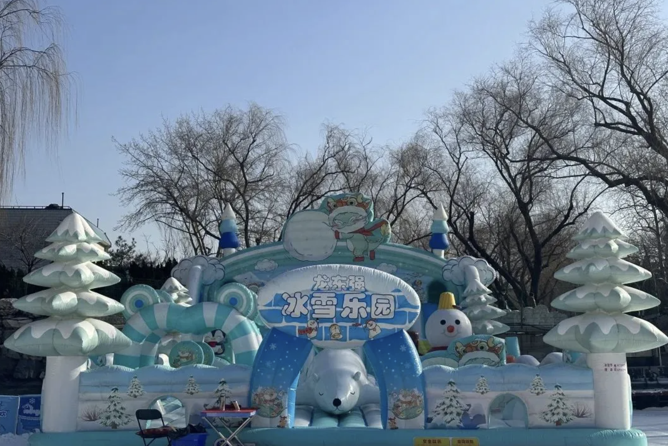 The snow area around the park's north and south lakes includes 18 fun activities, such as snow flying discs, snow bubble balls, and snow trampolines. Among these, six attractions are free, like penguin viewing, the snow ice maze, and snow seesaws. The most eye-catching attractions are the snow flying discs and the popular ice slide. The snow flying disc slide, 6 meters high, 30 meters wide, and 80 meters long, has 18 slides. Visitors can speed down the slide on a snow tube, feeling the rush of wind as they slide for dozens of meters.