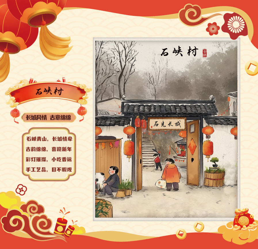 Follow the winding valley path southward along the Great Wall to discover Shixia Village, nestled in the gentle embrace of mountains. This tranquil village is adorned with decorative motifs inspired by the Great Wall, with every brick and tile whispering tales of its enduring connection. During the Spring Festival, Shixia Village's unique "New Year Celebration" theme offers visitors a fascinating time-traveling experience.
